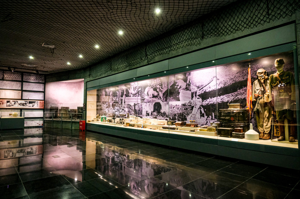 橱窗里陈列了八路军兵工厂制造的独厥手枪、八路军使用的地雷、新四军使用的手榴弹、八路军解放区的农民身份识别布标、还有纪念叶挺、王若飞将军飞机失事纪念章等物件。还有日军九四式军刀、日军三八式步枪等,并有“忠勇”字样的小刀,日军地下足袋,日军九零式铁帽等。