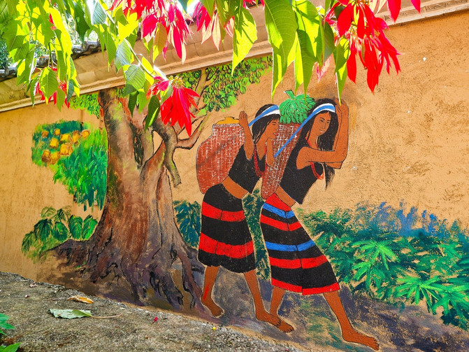 漫步村寨还能看到许多彩色的壁画,壁画的内容讲诉的是佤族特有的民风民俗。整个寨子中最具观赏的就是民族文化陈列馆,这里展示了佤族先辈们的农耕痕迹以及历史渊源,旁边的古树下,还有一座奇异的木质选择楼梯,聪慧的佤族人,造就了多姿多彩的佤族文化,令人叹服。