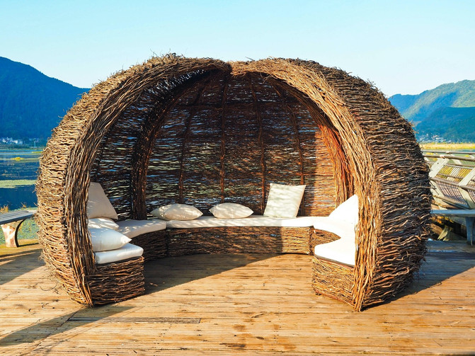 当船行驶到湖中央的码头,你就会发现远远望去的湖心别墅,其实是一座休憩的茶饮区。湖心中央的水上栈道连接左右,正中央是休憩的区域,四周有很多供游人 拍照的打卡点, 比如 网红玻璃球、网红躺椅等.......若时间充裕,不妨点上一杯饮品,在这里小坐一会儿,等候袅袅炊烟下最绚烂的落日美景。