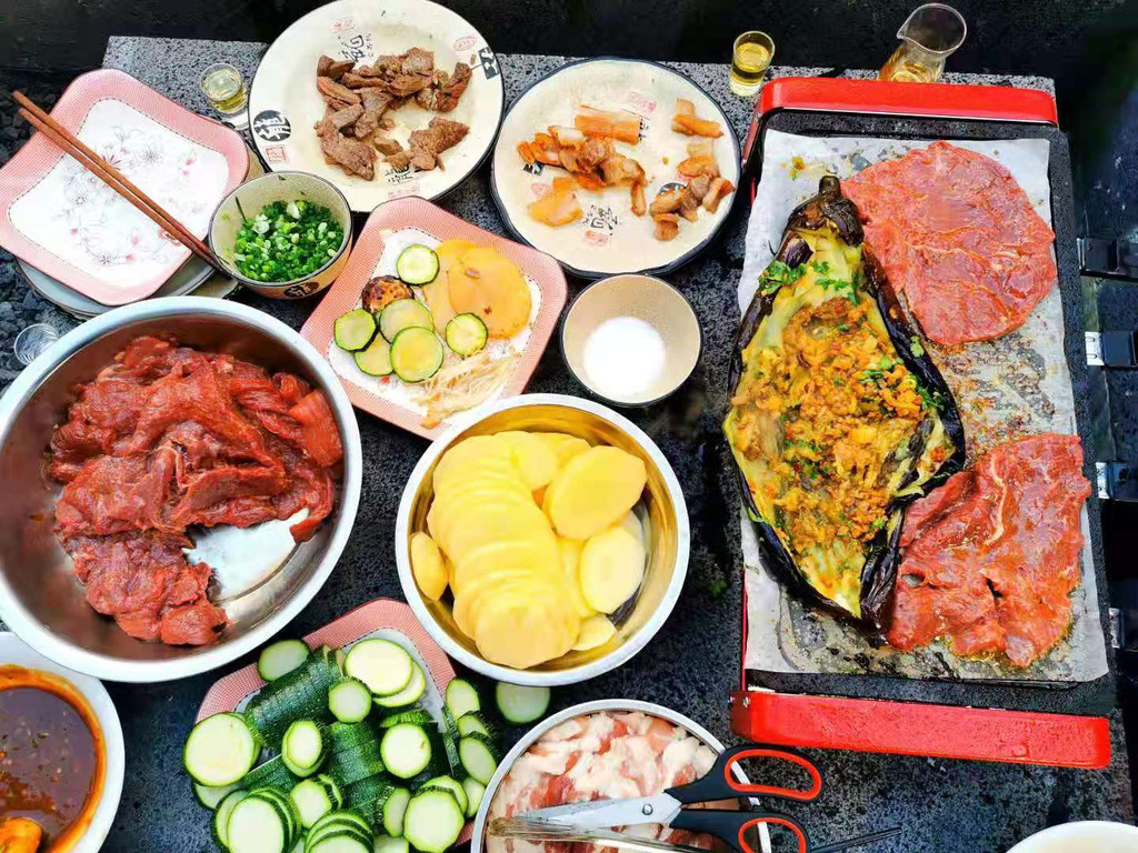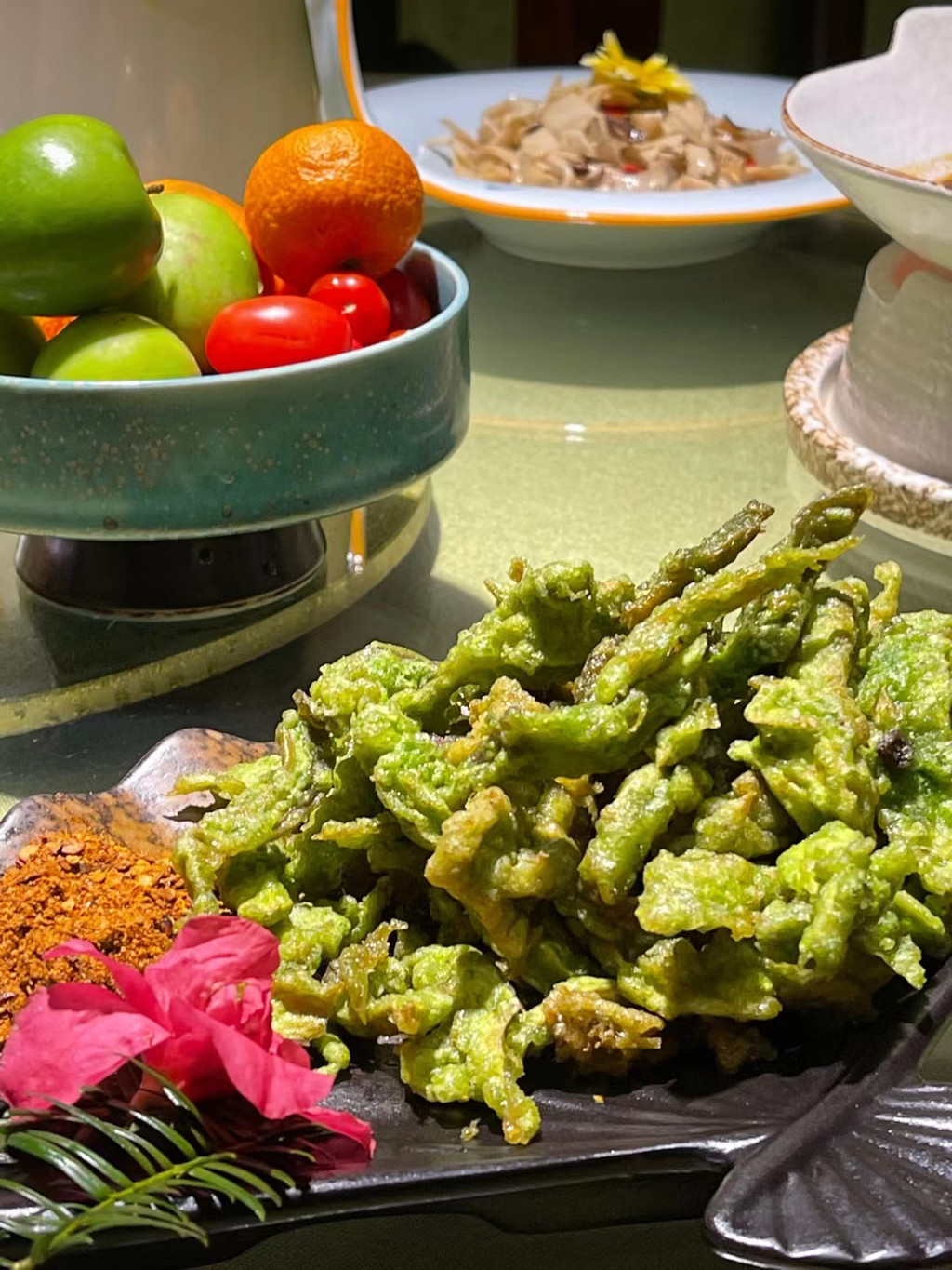 酒店花花和管家们的手艺 推荐指数 五颗星 (满满的享受) 从高黎贡回来,我们基本都累瘫了,路上买了一点食材,麻烦管家们帮我们加一下工,胡乱的买了一些肉和蔬菜,就回酒店泡温泉去了。泡完出来一看,好家伙,满满的一大桌,色香味俱全!