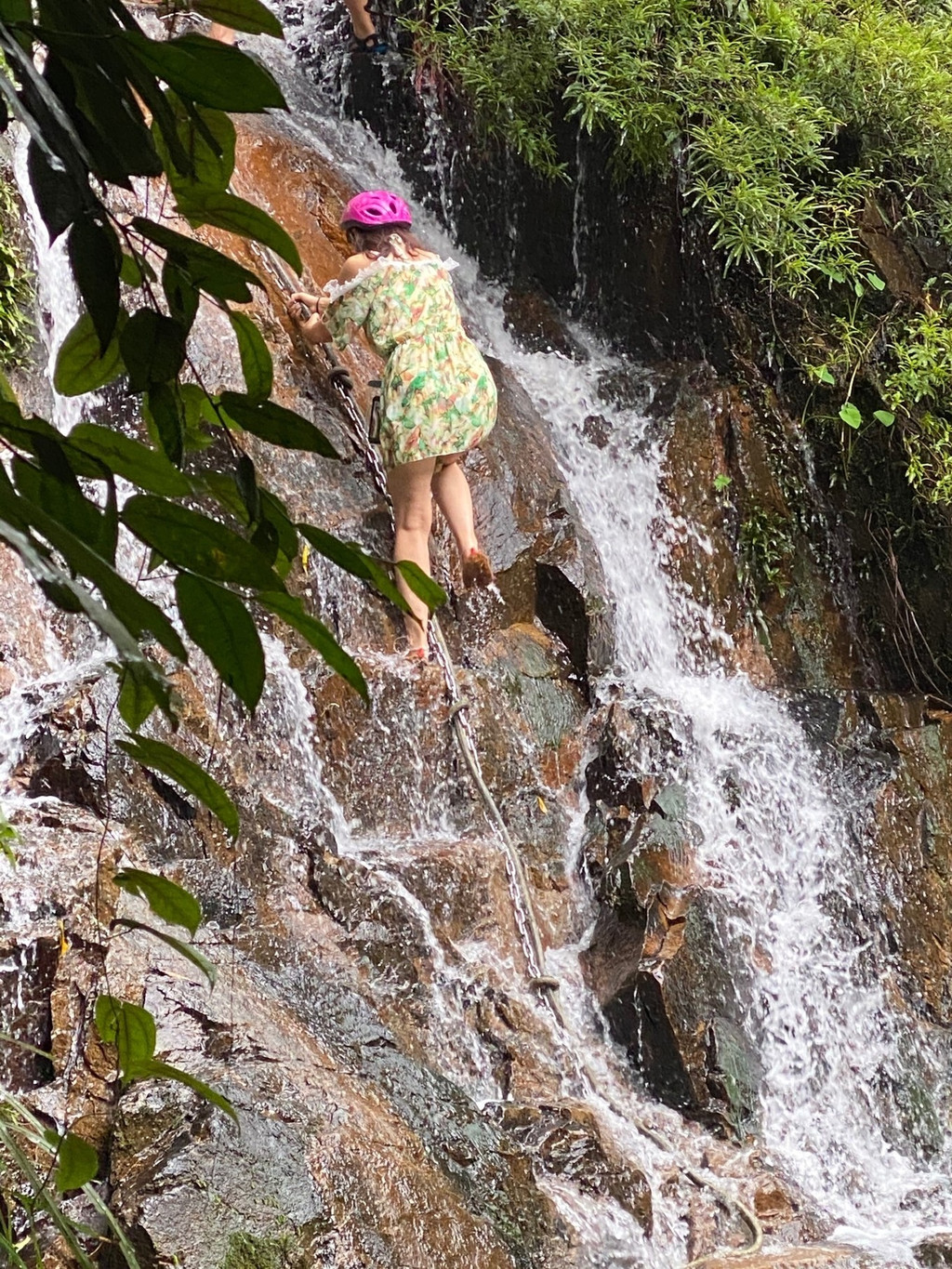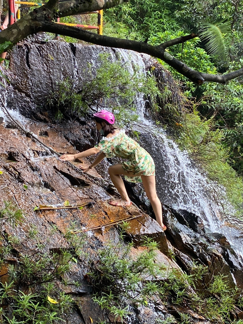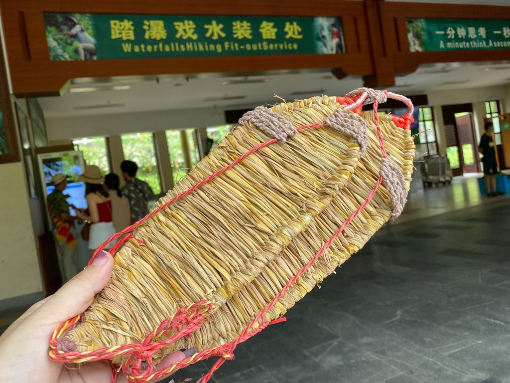 因为是沿着高达70米不停飞溅的瀑布,手抓铁链,向上攀行,很带感。不得不夸下脚下穿的草鞋,抓地太牢了,真的不会打滑,难怪古人上山采药啥的都穿这种鞋。