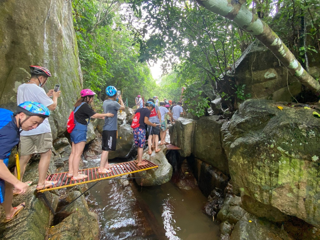 出发前领队会培训要领,教大家如何安全过关,全程急流、怪石、瀑布都有,巨石、巨树等构成了想要征服的神秘地带。第一关最难,人猿 泰山 ,需要拉着绳索,荡到对岸即为过关,即便领队说了要领,但百分之99的都落水了,成了真正的湿身之旅!