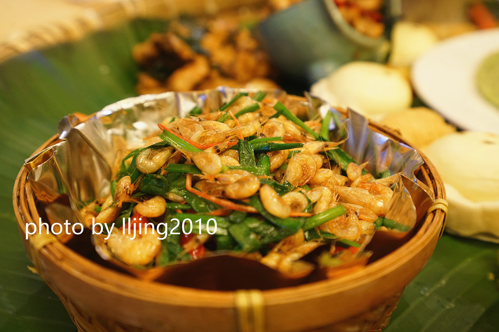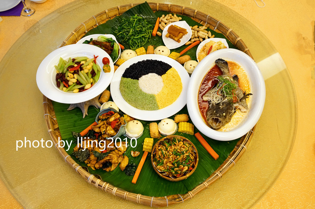 黎家簸箕宴,把美食放在簸箕里的芭蕉叶上,丰富程度可按人员食量多少来定