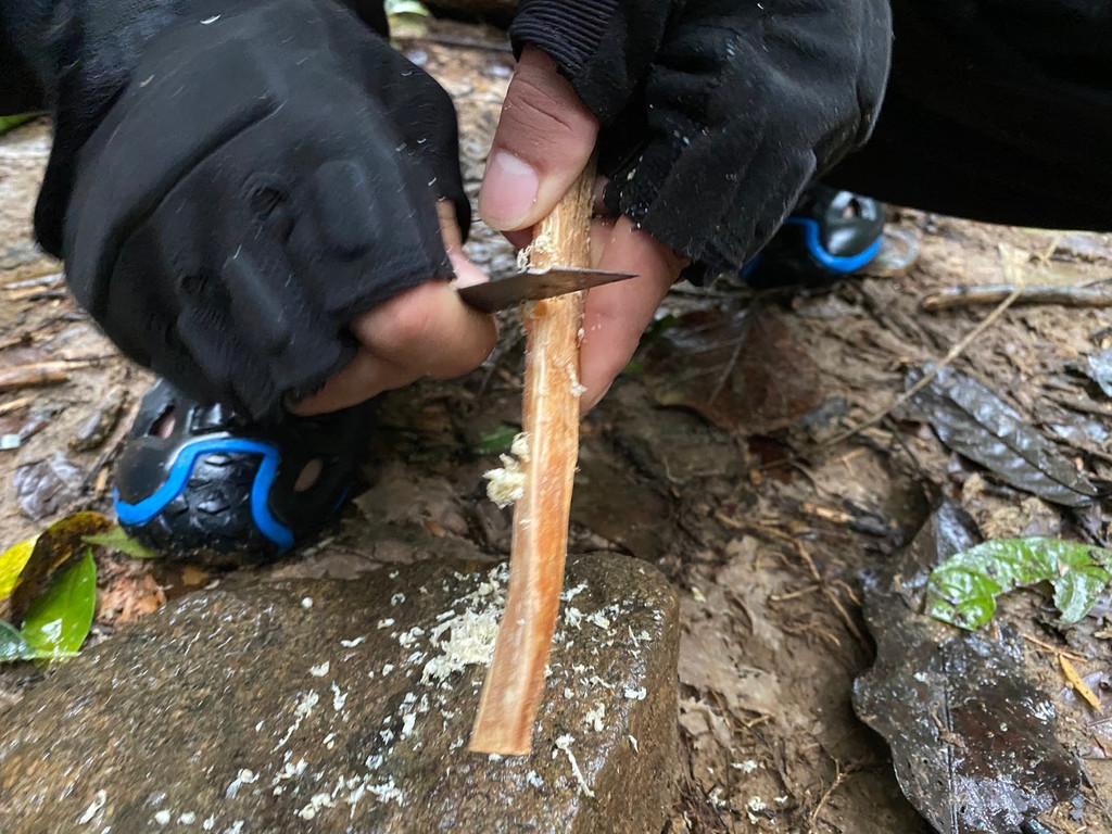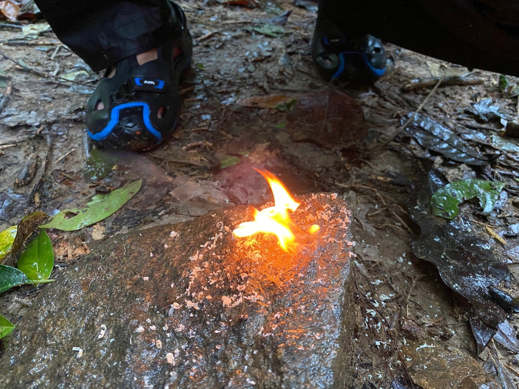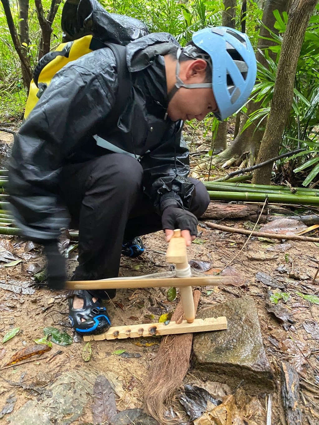 野外取火的方法,有一些小工具就方便多啦!教练演示钻木取火、击石取火。实操起来也是非常费力气的。