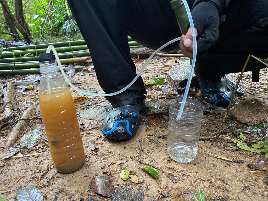 户外取水,净化,也是有小工具比较省心了。使用净化过滤装置的好处是即时可以喝到水,不需要太长时间的等待,也是最安全的净水方式。如果没有就要使用原始的层层过滤瓶,多次过滤直到能达到烧开饮用的标准。
