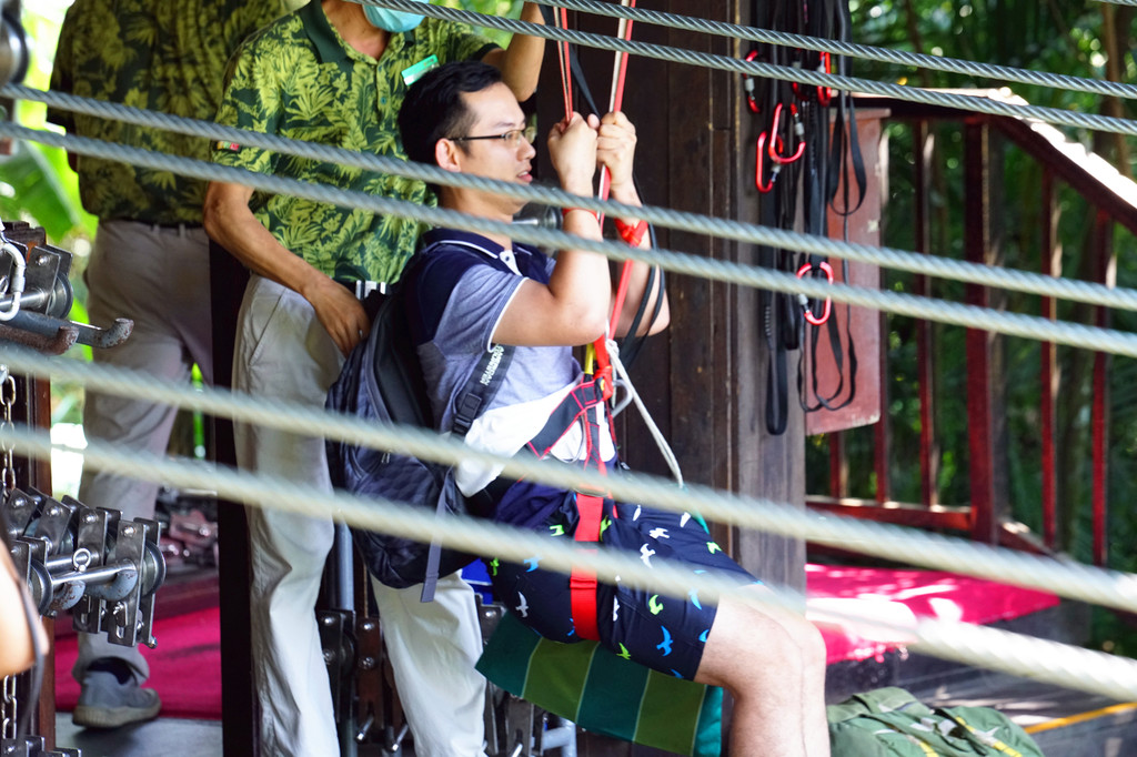 看到一个小朋友也在滑索,还加了重物袋来保持平衡。
