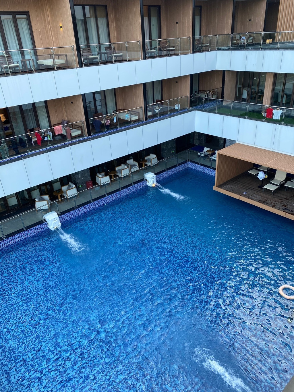 建筑呈H型,中间是大大的泳池。每间客房都有落地窗和户外阳台,可随时呼吸雨林气息。