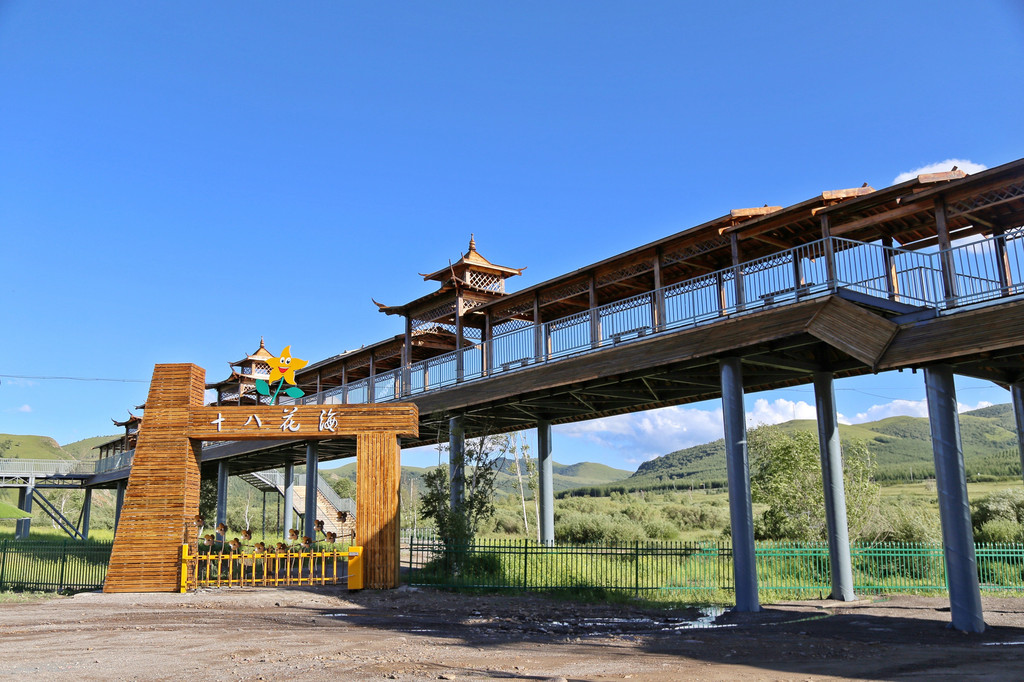 由金莲湖、美人谷、百花湿地三大自然景观组成,因18道彩带般的立体花海而得名。景区面积8.6平方公里,有92科800余种天然植物,集中了草原、疏林、花海、湿地、湖泊等多种自然景观。