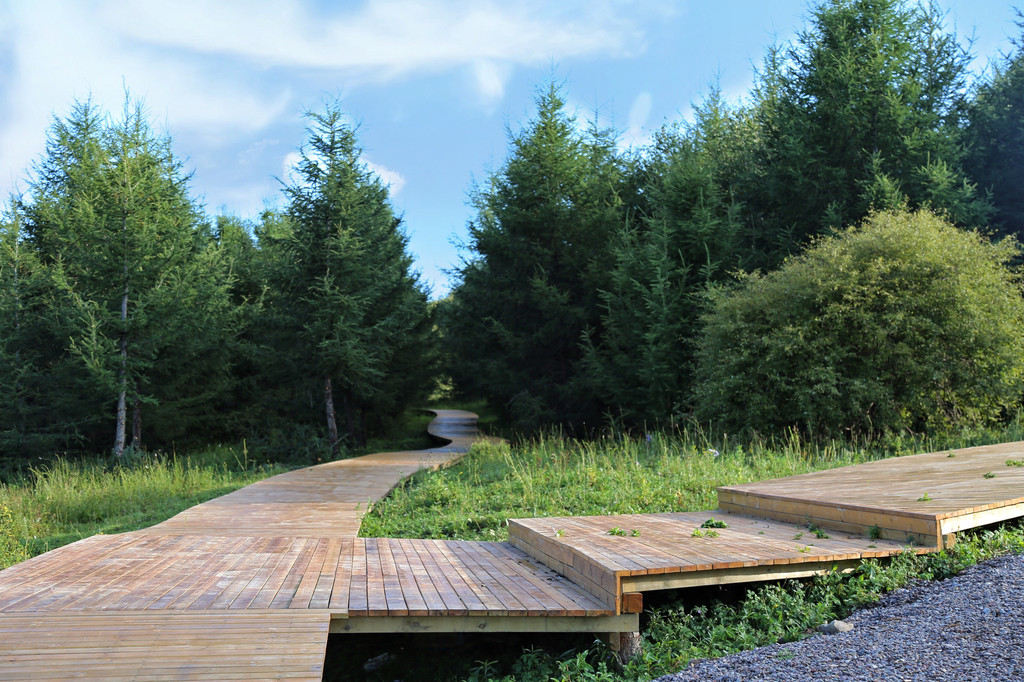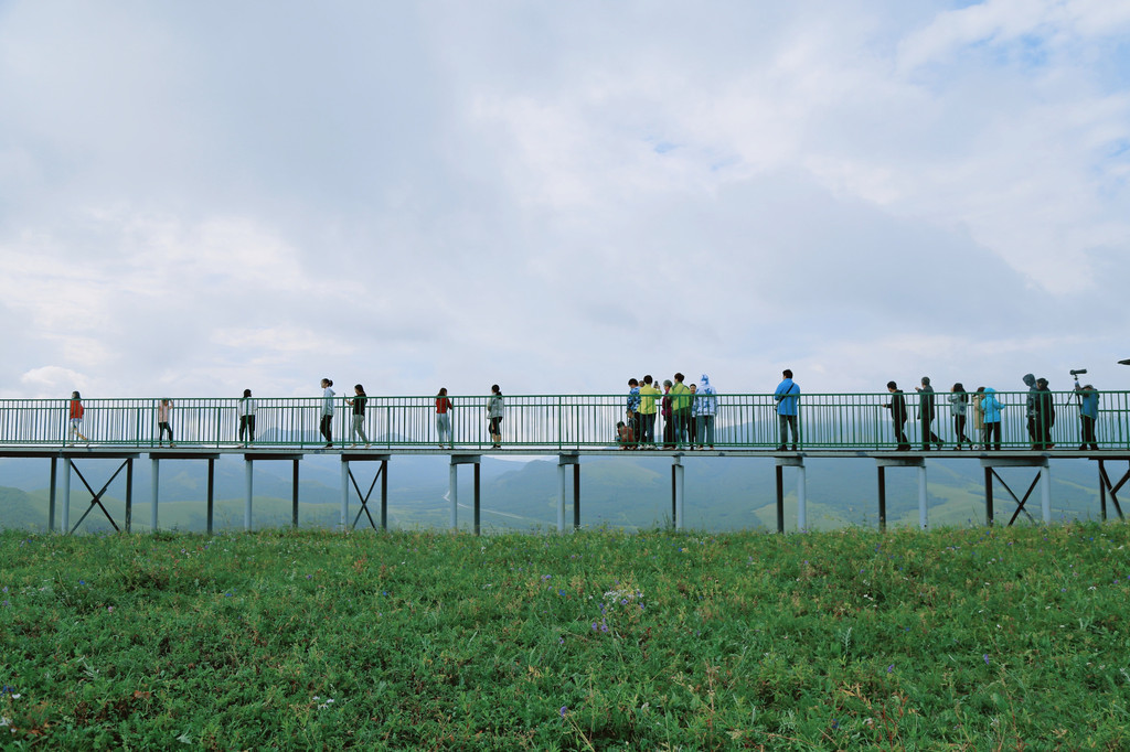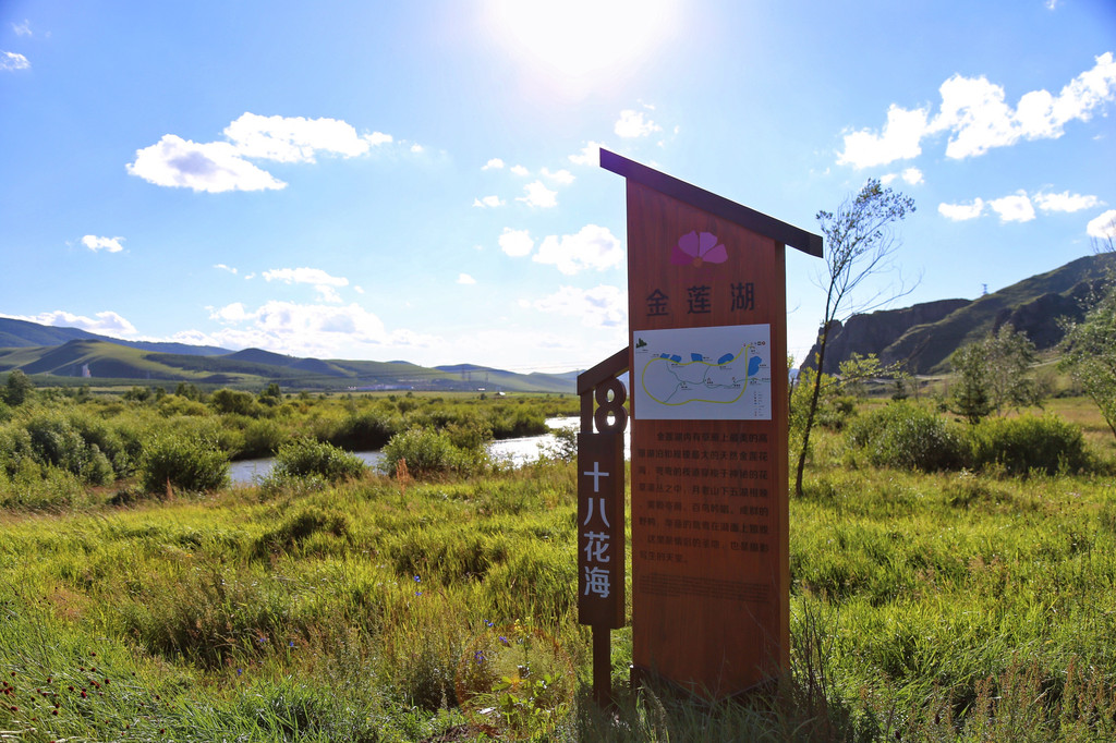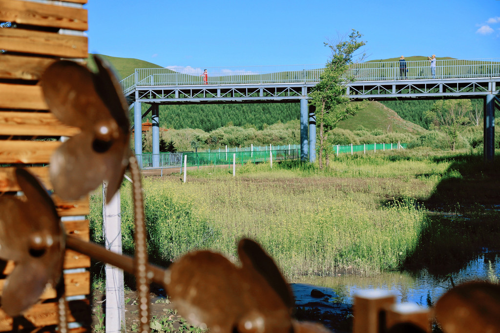 登上空中走廊遥望四周,绿色的是草原灌木,彩色的是野花,隐约闪烁的是阳光下的金莲湖和湿地。