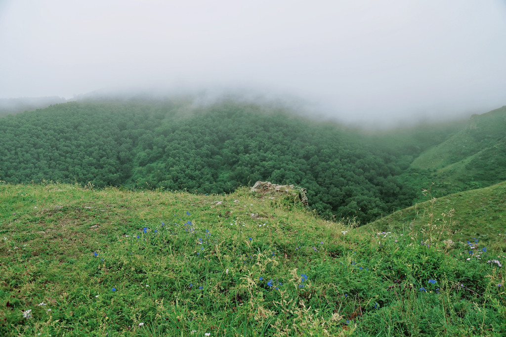 出发坝上正是北京暴雨预警的那一天。暴雨虽没有追到这里,却也是乌云密布,山间升起浓浓烟波。正是这样的天气,让天地一片朦胧,让我们在山顶有了一种恍若仙境之感。