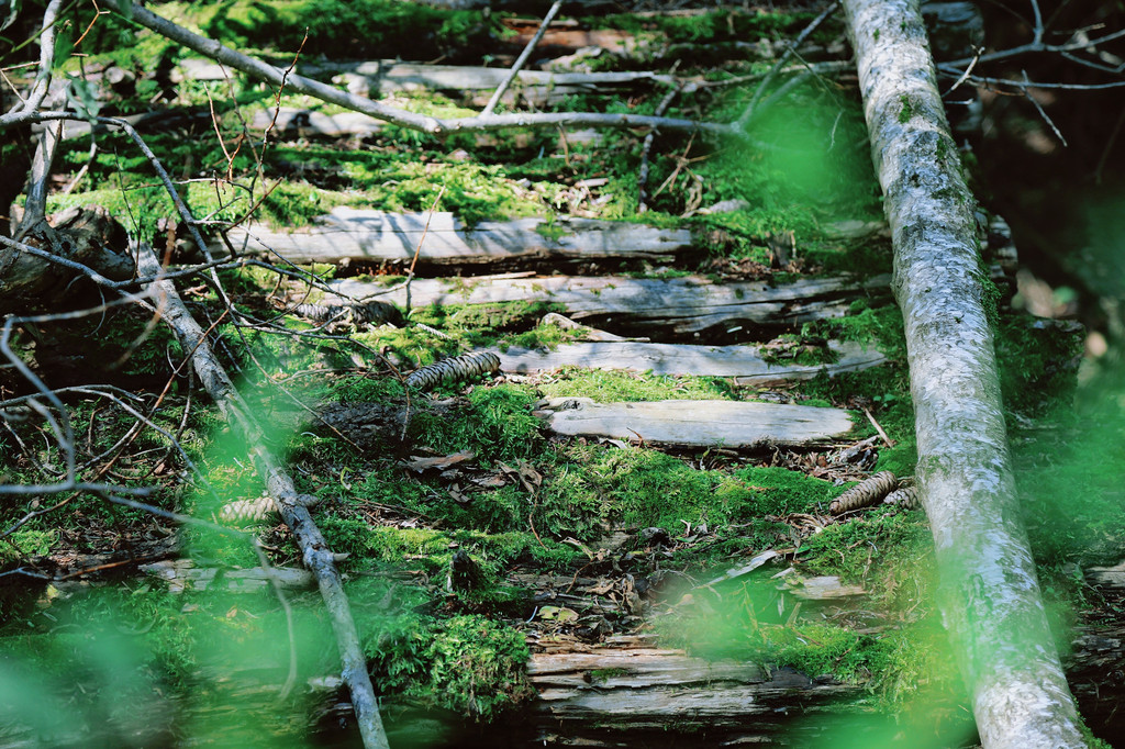 木栈道在树林里蜿蜒穿梭,挺拔茂密的枝干遮蔽了阳光,脚下有若隐若现的潺潺溪水。
