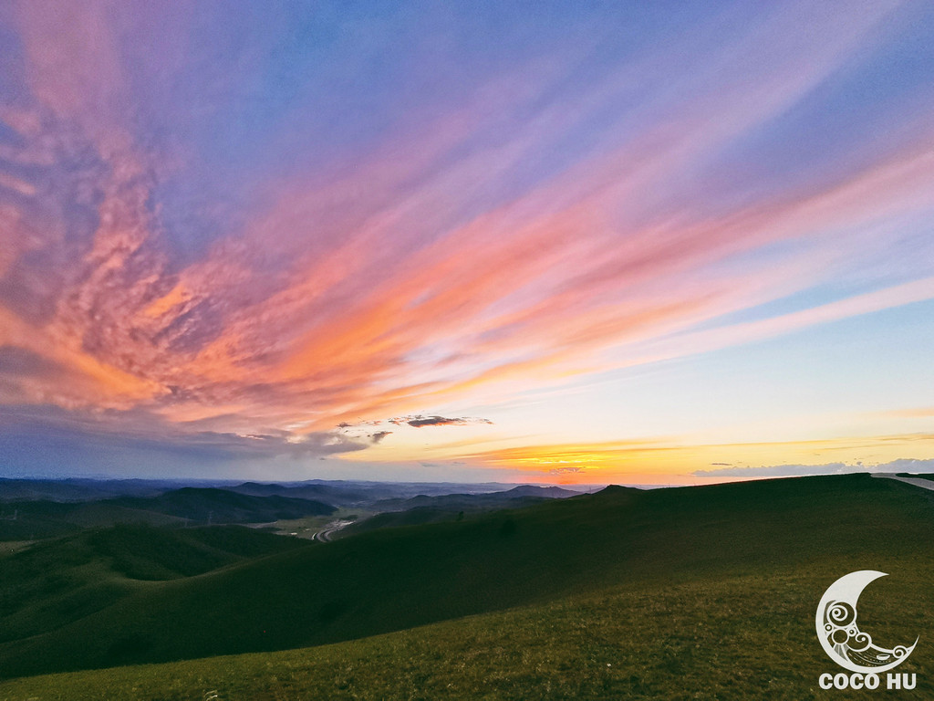 在金黄的落日和紫色的晚霞中,我们大口呼吸着雨后草原的青草香。