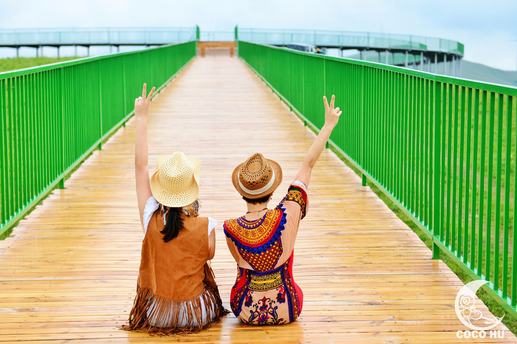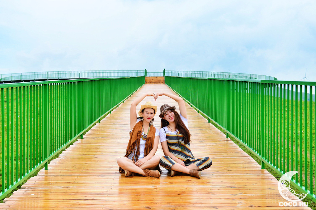 通往观景台的木栈道在细雨洗涤后格外透亮,木色和我们的服装主题色非常搭,再加上两边的绿色围栏,起到跳跃和点睛的作用。于是只要你往木栈道上一座,正面也好,背影也罢,既有延伸感,又有代入感,也是出人像大片的天然背景。