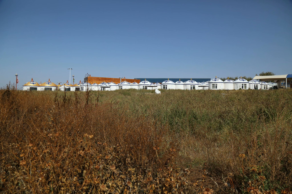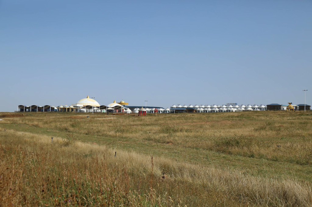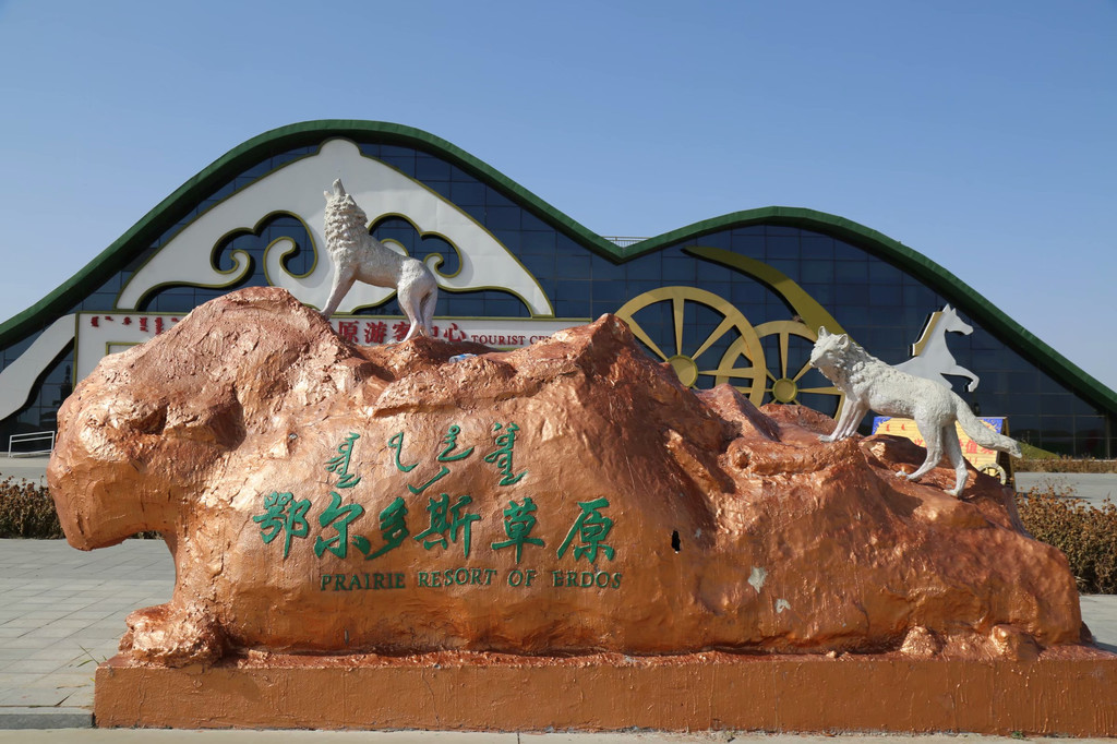 鄂尔多斯草原旅游区设计独特,别具一格,核心区有一个蒙古大营和300多个蒙古包组成的蒙古包群,整体景观如同一只展翅雄鹰翱翔在鄂尔多斯草原上。作为国家4A级旅游景区,鄂尔多斯草原开设了那达慕实景马术剧、诈马宴、飞天草原、篝火晚会和婚礼表演等五大文化旅游产品。时值淡季,游人不多,金漆白帐的古如歌餐厅里,正在为2位客人上演精彩的节目。