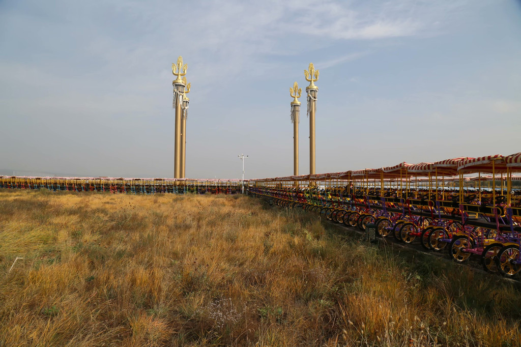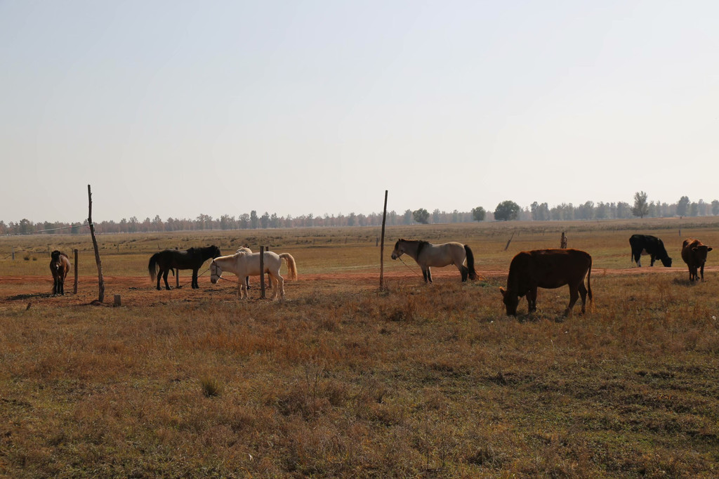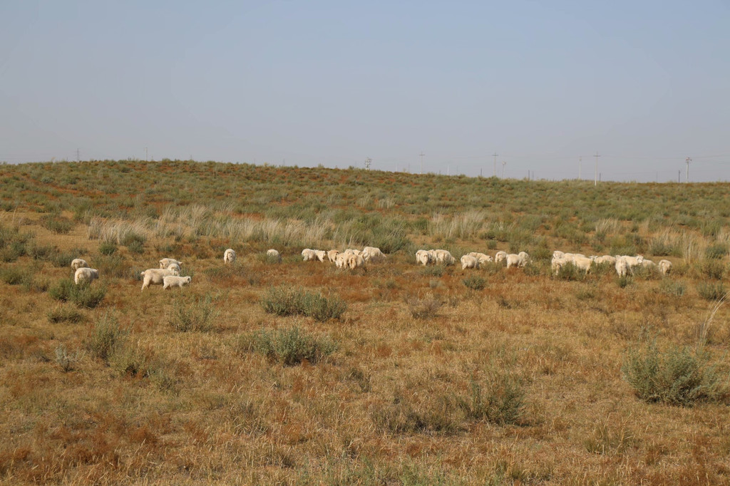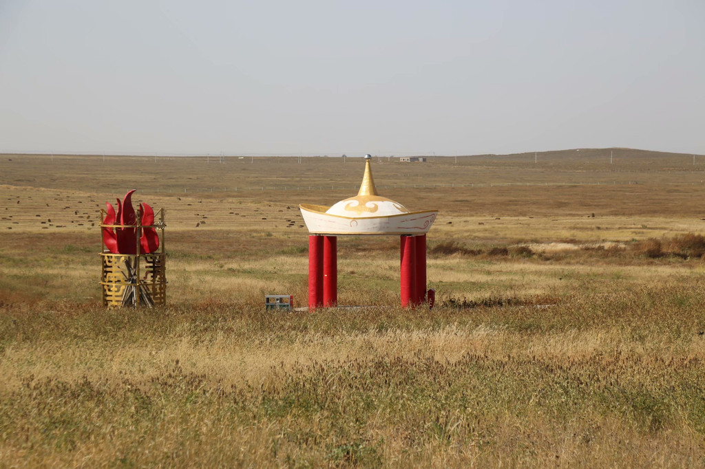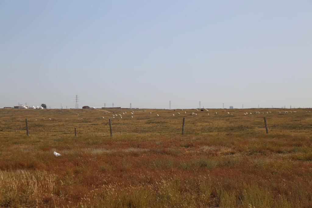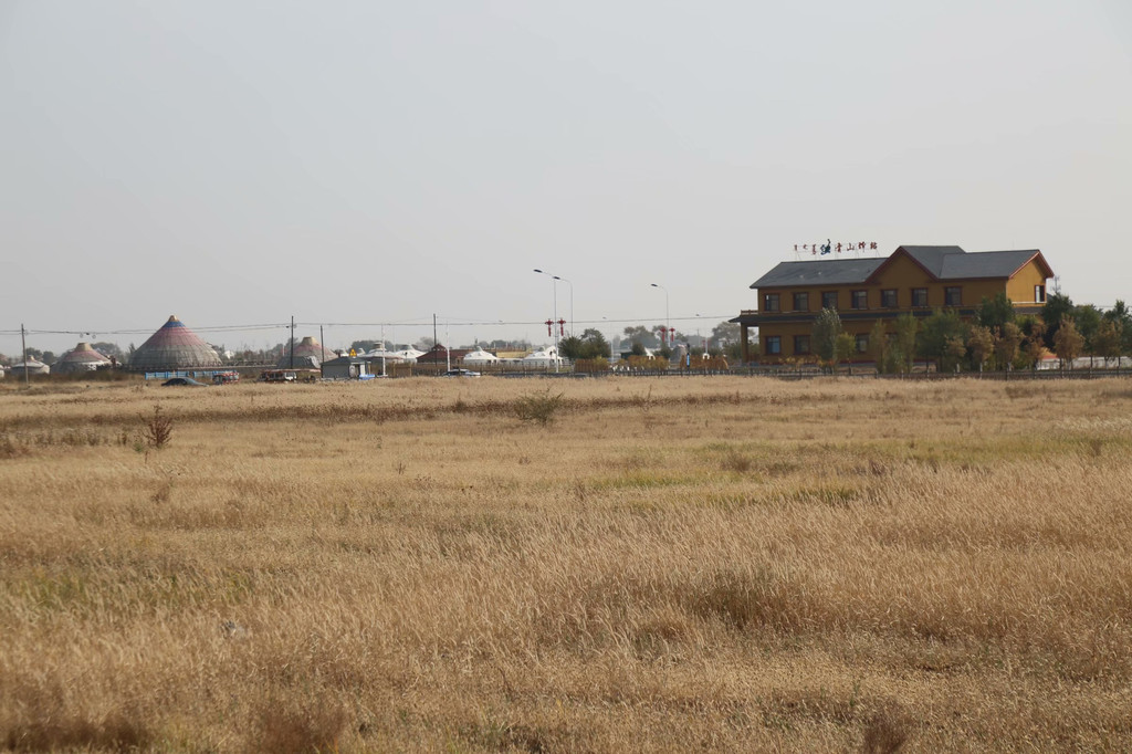 敕勒川是宁甘蒙之行的最后一站,是司导羽丰送给我的告别礼。南北朝时就有一首敕勒歌,“敕勒川,阴山下,天似穹庐,笼盖四野。天苍苍,野茫茫。风吹草低见牛羊。”10月10日下午来到敕勒川草原时,天空幽暗,牧草泛黄,没有了诗中蔚蓝的天空一望无际,碧绿的原野茫茫不尽的胜景。
