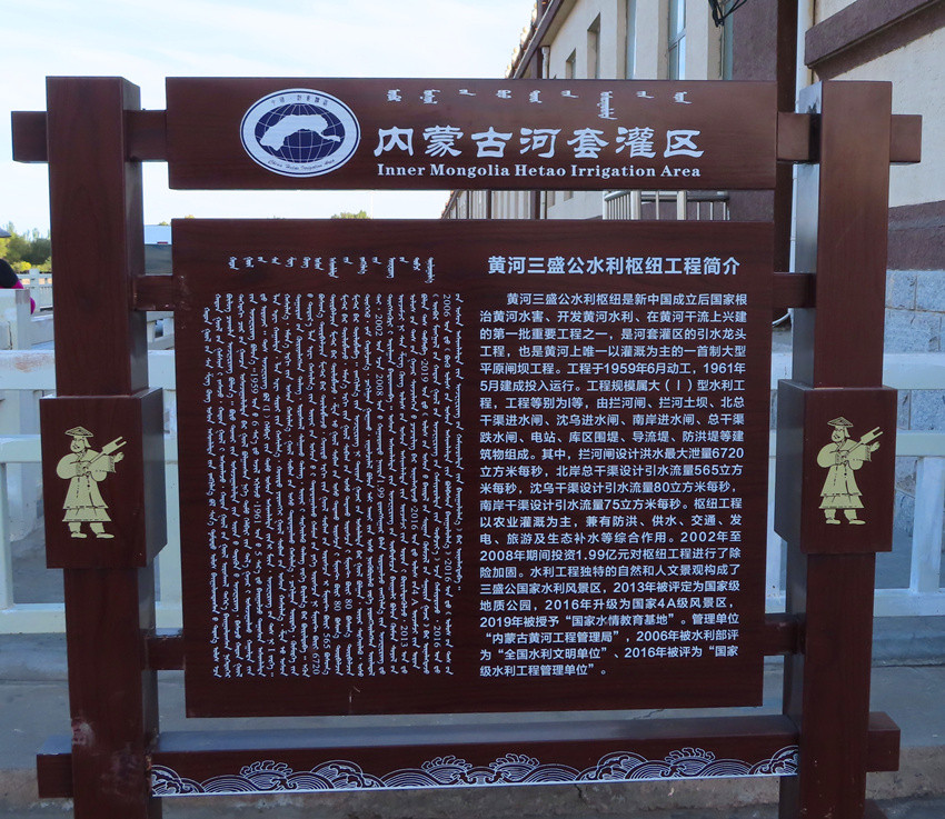 接下来,我们参观了黄河三盛公水利风景区。它位于黄河干流的上中游,著名的“几”字弯头,三盛公水利枢纽工程依法确权划界的管理范围内;地处内蒙古自治区巴彦淖尔市磴口县、鄂尔多斯市杭锦旗、阿拉善盟阿左旗接壤处;分布于磴口县巴彦高勒镇(原名三盛公)东南的黄河干流两岸。作为风景区,它具有雄浑壮观的大河风光,神奇壮美的沙漠景观、气势宏伟的枢纽工程,以及良好的生态,鲜明的地域文化,丰富的自然景观和人文景观资源。