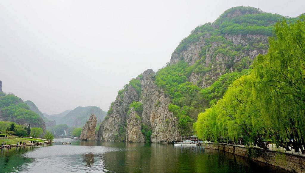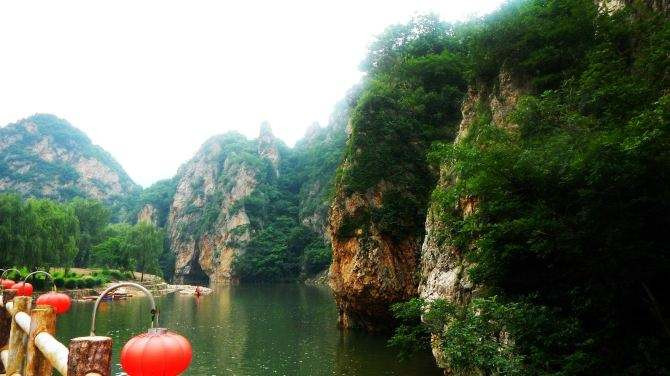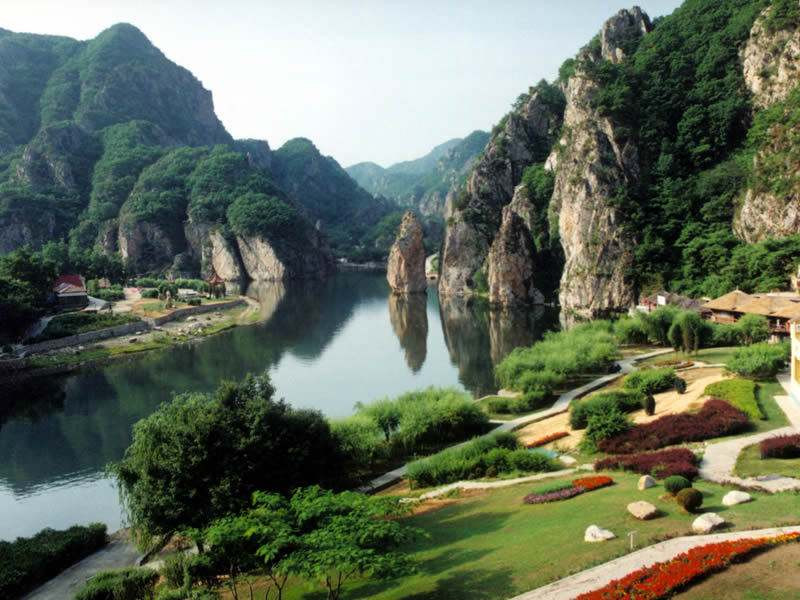 冰峪沟群山峻峭,奇峰竞秀,漫山草木葱茏,崖上松柏苍翠。远处主峰高耸入云,祥云缭绕;身旁山谷碧水泛波,岚景浮青,溪流淙淙。