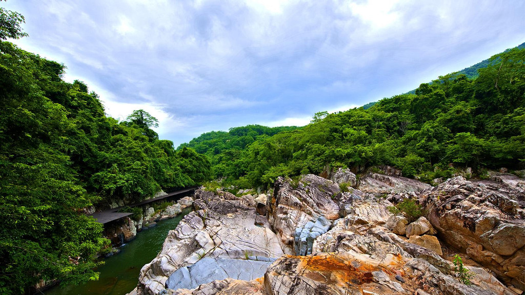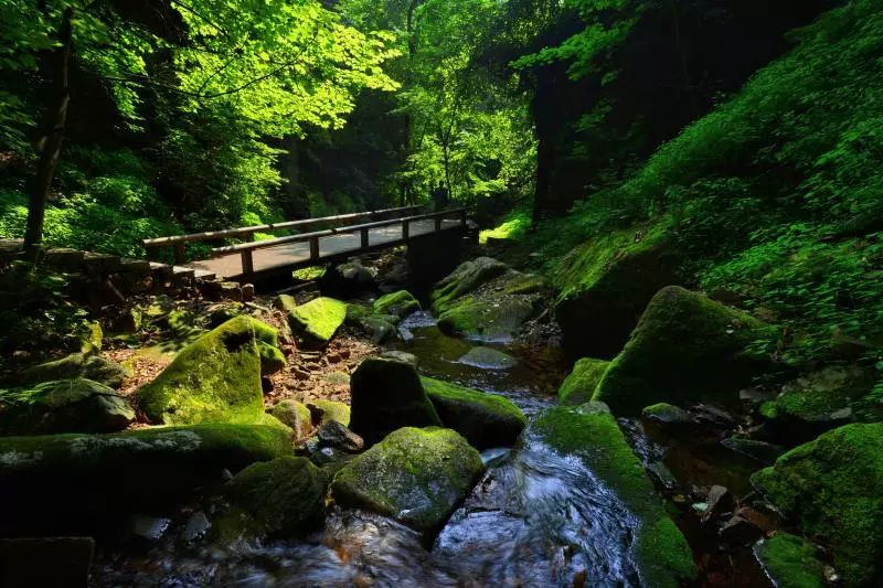 幽幽的峡谷内古木参天,潺潺的溪流滋润着河床上的绿石,古朴的木栈道穿行其间,这里负氧离子每立方厘米含量可达3万个。