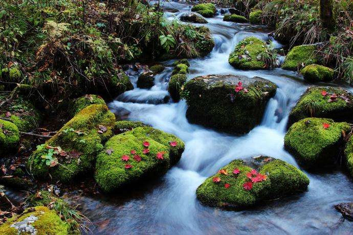 在炎热的夏季谷内青峦叠翠,清风习习。溪水峰回路转或急或缓,微小的落差造成数不清的大小瀑布,如珠链、如绸缎,清澈的流淌在谷内长满青苔的圆石、枯木之间。盛夏,满谷湿地,绿苔茵茵,上百种花木争奇斗艳。