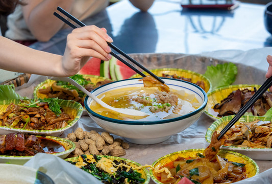 农场已经是在山顶上了,视野开阔,风景靓丽,很适合休闲,不过我们早已饿的不行的肚皮也让我们先行用餐,享用了一顿美味的簸箕宴,这簸箕宴也是很有特色,用一张小小的簸箕装着,蔬菜基本都是农场自种的,很是淳朴又特色。