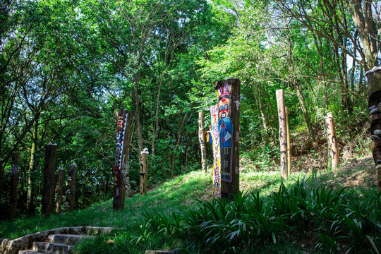 沿着游步道上山,在森林间漫步,呼吸新鲜空气,听着鸟儿的啼叫,也觉得身心开始舒展起来,游步道之上是一段小吃街,能够品尝到北川这边的特色小吃,还能休憩片刻,我们品尝了特色的腊肉香肠休息后便继续向山上走去。