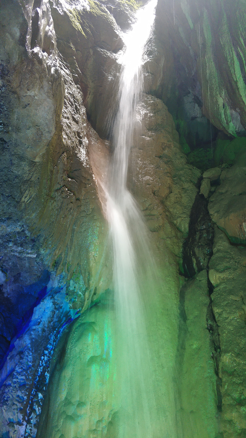 距离德天瀑布1小时车程,通灵大瀑布和德天大瀑布区别在于通灵大瀑布单体垂直高度大,且因为是个峡谷,其中绿色植被覆盖,负氧离子空气清新,但据讲解员介绍,很多树木植物有毒,不可随意触摸摘取,其中最多得是桄榔树和桄榔果,进入景区需要下800多级台阶,台阶两边有青苔,湿滑且陡,要小心脚下。路边会有蚂蝗出没,我就不幸中招,等发现的时候脚下已经出了一小滩血,感觉粘腻了才发现,所以尽量长裤长袖吧。头上也会有水滴下来,伞和雨披必备,一路下到最低就是通灵大瀑布,长长一条仿佛从天而降,之后沿地下暗河往回走,可惜雨水太大,水帘洞没有开放,整个景区下来大概2个小时足够