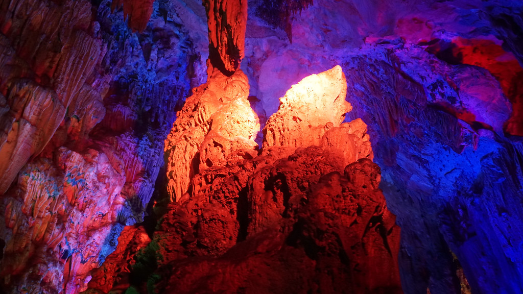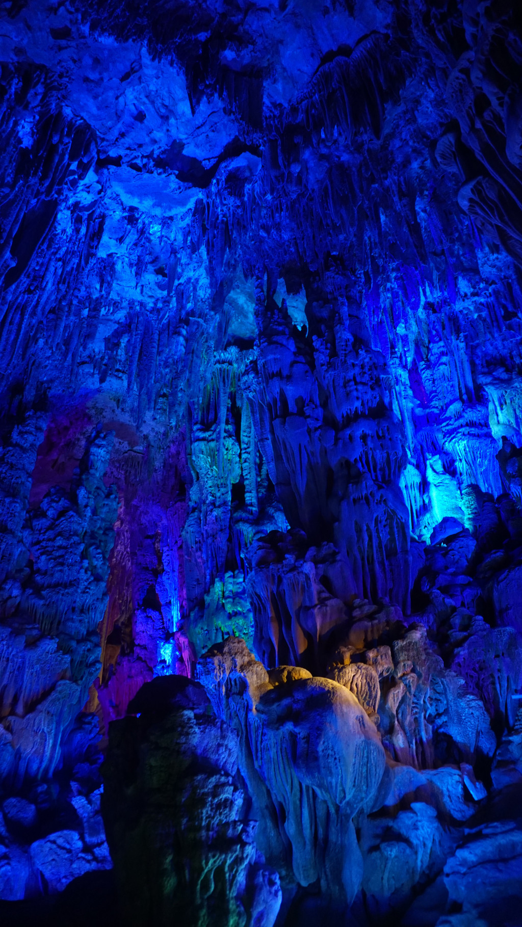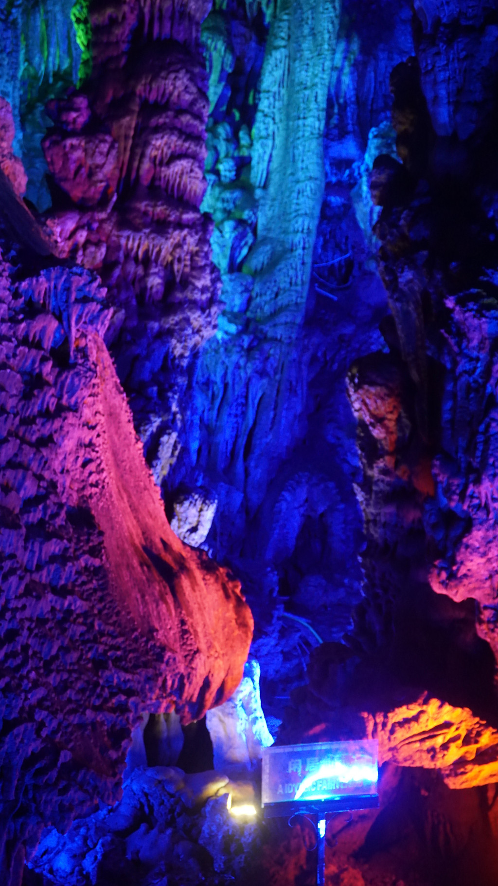芦笛岩游玩差不多1个半小时,一小时洞里跟着讲解员走一遍,半小时上下山。芦笛岩里蛮大的,路不算难走就是有点黑有点湿滑,灯光打在各式各样形状的钟乳石上,视觉效果挺棒~