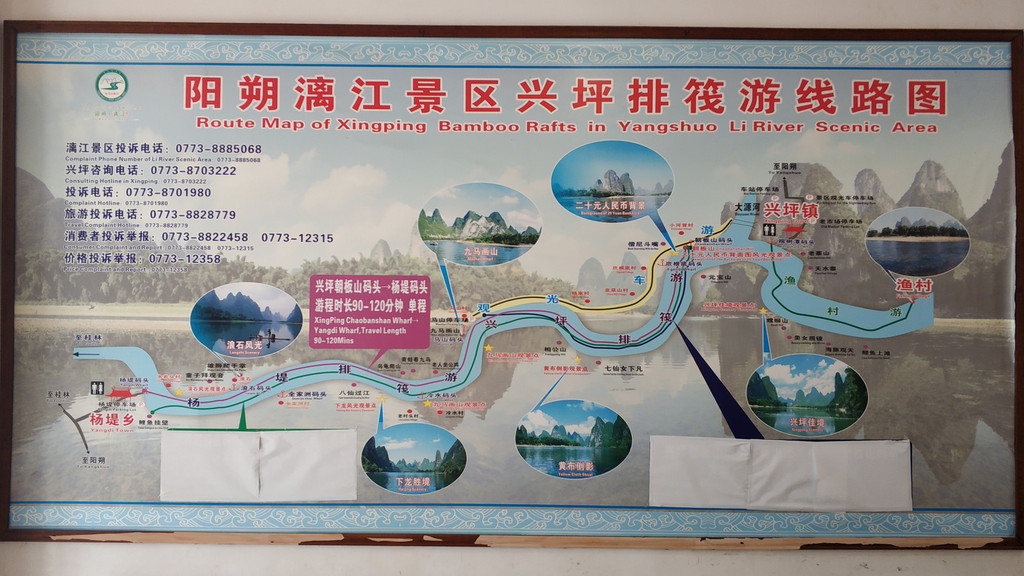桂林到兴坪镇开车2小时,在兴坪镇游客中心购买漂流的门票,从兴坪朝板山码头到马山(九马画山)是半程80元(单程),从朝板山码头到杨堤是全程170元(单程),从兴坪镇到朝板山码头,也就是20元人民币背景图案的地方,需要做个电动瓶车,然后从马山码头结束单程竹筏,再坐电瓶车回到兴坪镇,联票包括两段电瓶车和一个单程竹筏,电瓶车票也可以单独购买,一次20元,漓江的竹筏是电动竹筏,上面有篷,四人一船,人不满需要拼人,否则有空座位需要补钱。
