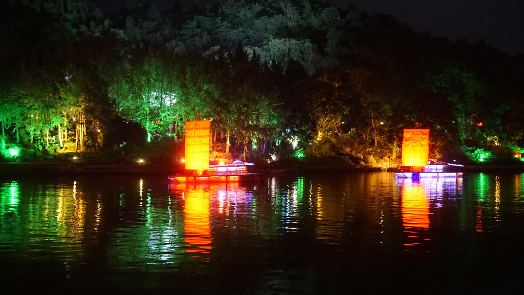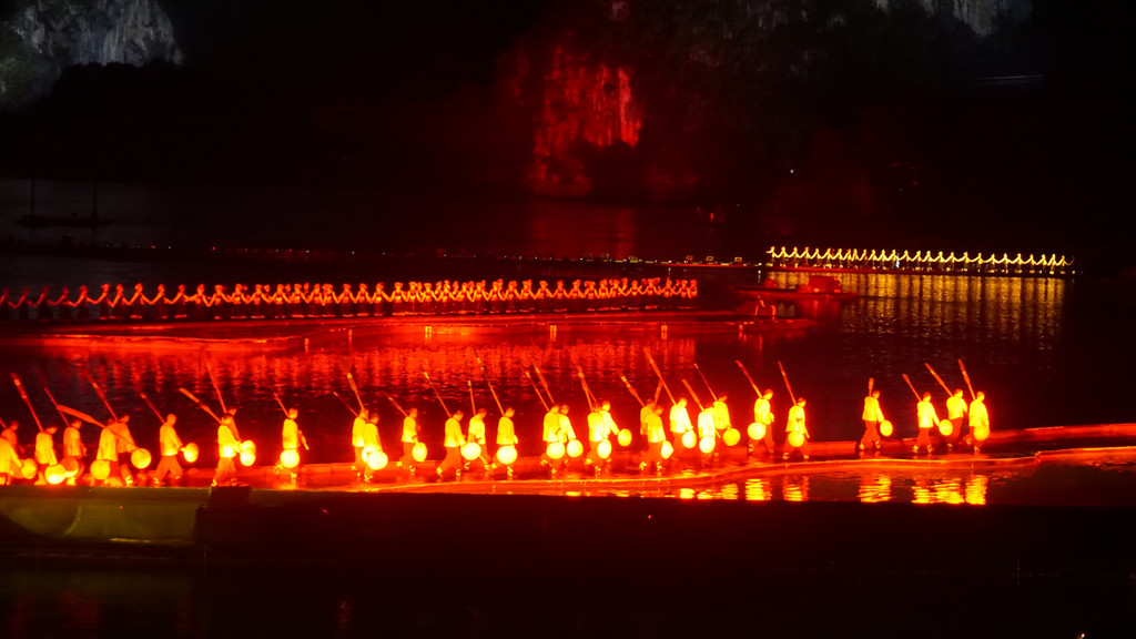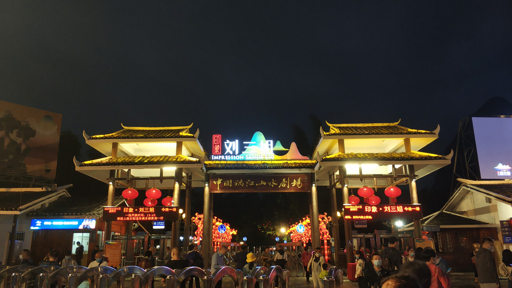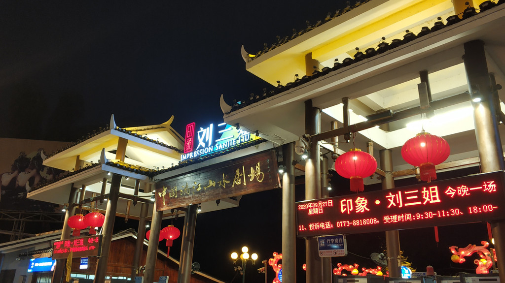 印象刘三姐19:45开场,18:50开始进场,要提前去,进场还有段很长的路要走,演出一个小时左右,音效和灯光都很不错,露天演出座位,在进场时有雨衣可以领,小雨不影响,大雨可能就不行了,演出是在水上,应该有超过三百多人吧,旺季的话21:00还有一场,谢幕后大屏幕上有导演信息,居然从2004年就有了,至今也十几年了~