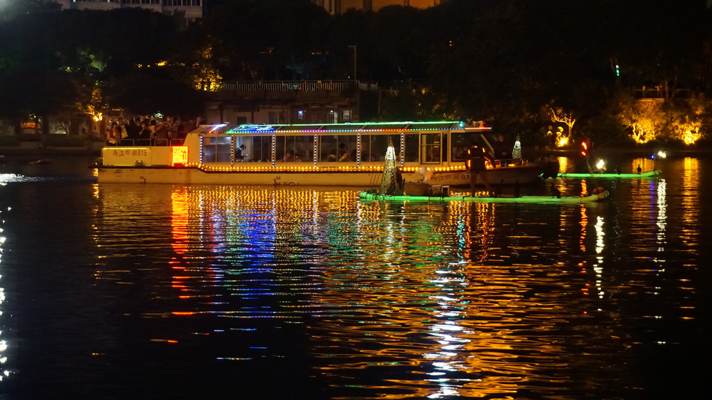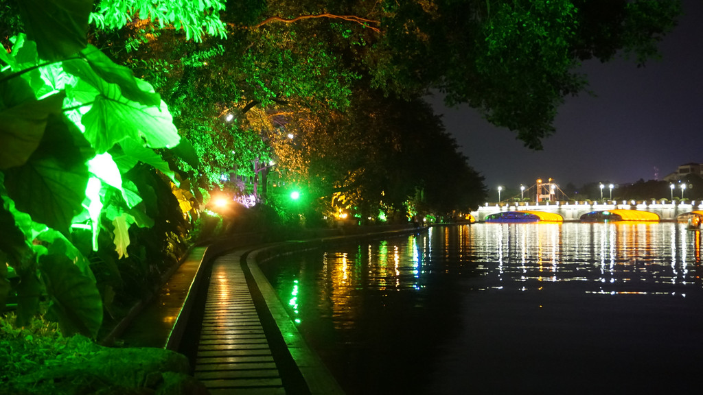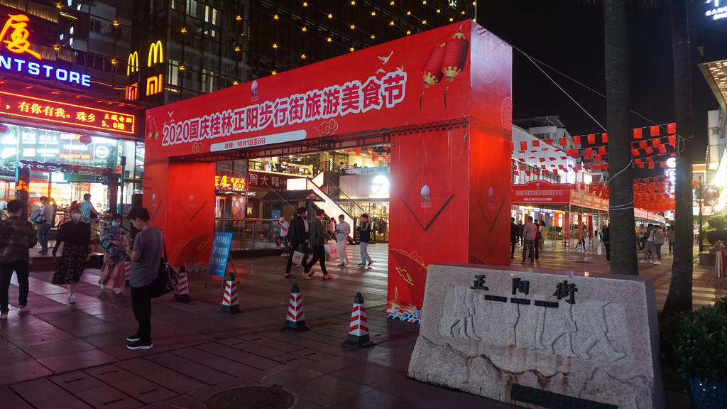 抵达桂林,日月双塔,夜景比较漂亮,公交到阳桥站,下来沿湖边走就能看到双塔,进入双塔需要门票,仅在外围远观免费,可步行至正阳路步行街,下午人气不足,小摊也没出来