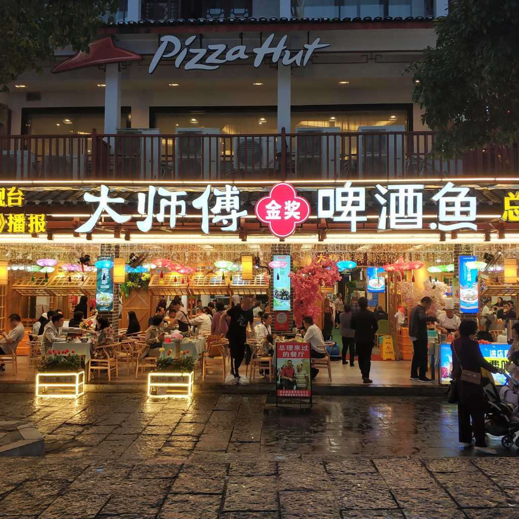 阳朔西街距离印象刘三姐2km,步行半小时左右,路上有电瓶车可以叫,10元左右,西街下午人不多,从5点左右开始热闹,满大街的大师傅啤酒鱼,也不知道哪个正宗,看网上排名吧