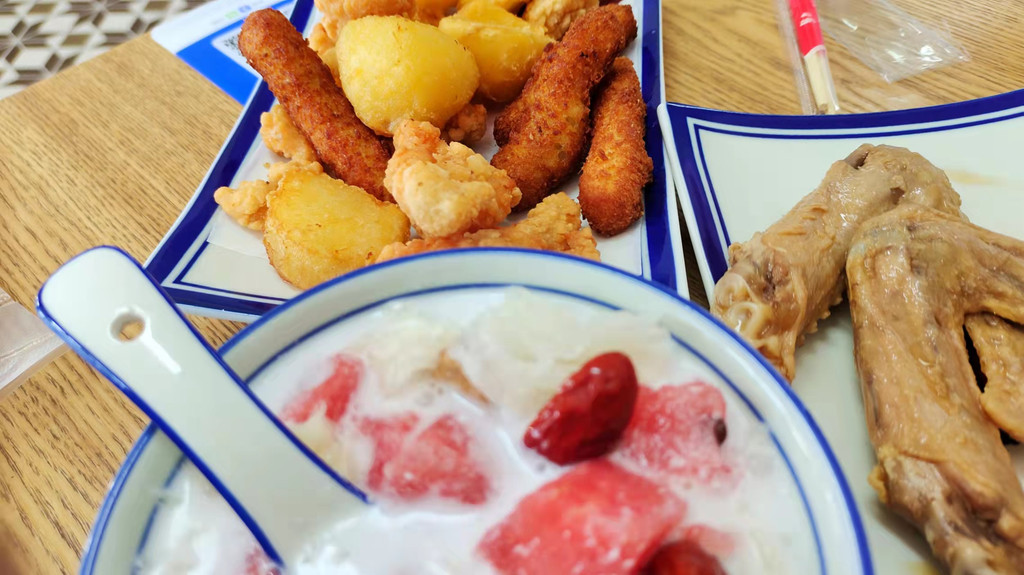 其实广州也是一个喜好食的城市,作为一个饕客,不得不试一下当地的甜品,点了两份清补凉水果捞,冰冰凉凉,甜而不腻,清凉一夏,外加一份炸物小食,外酥里嫩,炸土豆很绵密,炸海虾有种日本天妇罗的口感,或许是食材自带的天然鲜味丰富了味蕾。糖水铺的老板娘说,这边卤味+糖水是最佳拍档,不妨一试。这边卤味跟广州有区别,香甜中带一点辣味,中和了糖水的甜蜜。