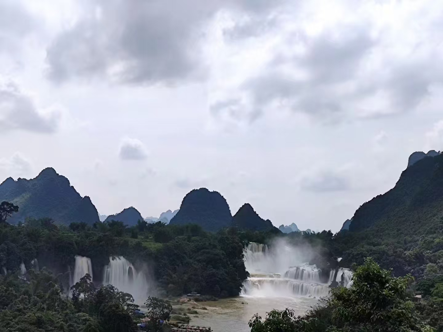 今天早早起床,去住宿楼下吃了一碗米粉,再去旁边的凤岭客运站坐专线车去德天大瀑布了(去德天大瀑布的专车不管在哪个车站坐车都要提前一天订,不然很容易就没票)。从南宁去德天大瀑布,要3个多小时车程,不过看到瀑布那一刻坐这么久的车是值得的。由于我们到瀑布的前几天一直下暴雨,令到景区的水量增加,景区为了大家的安全所以没有开放竹排给游客乘坐,也因为暴雨过后的原因,瀑布的水是混浊的但水量就很大很大。