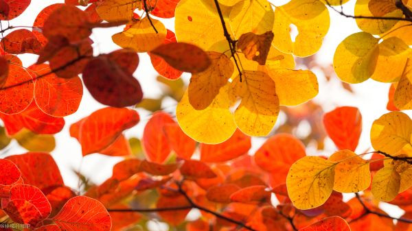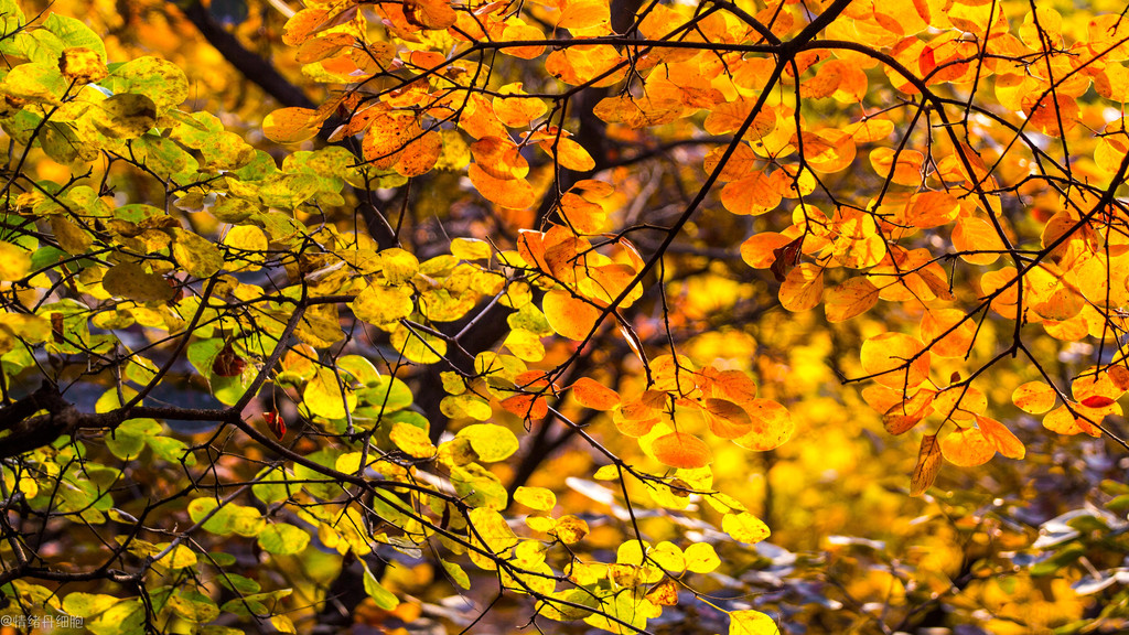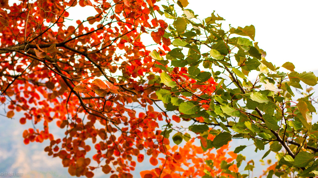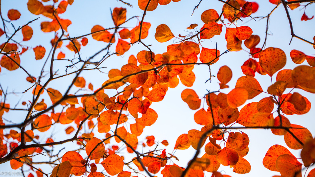 此时的黄栌完全没有了夏天的模样,每片叶子都成了这大山中的小精灵,努力的释放着光彩,集万千宠爱于一身,五彩斑斓中绽放最美秋色。大片的红色、黄色,那么热烈,那么奔放, 那么不讲道理,而密林掩映的绿色,如此的自然,如此的安静。