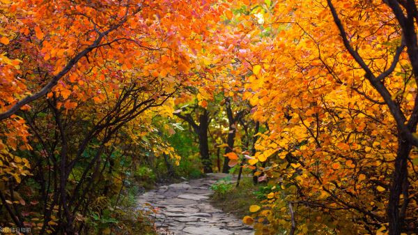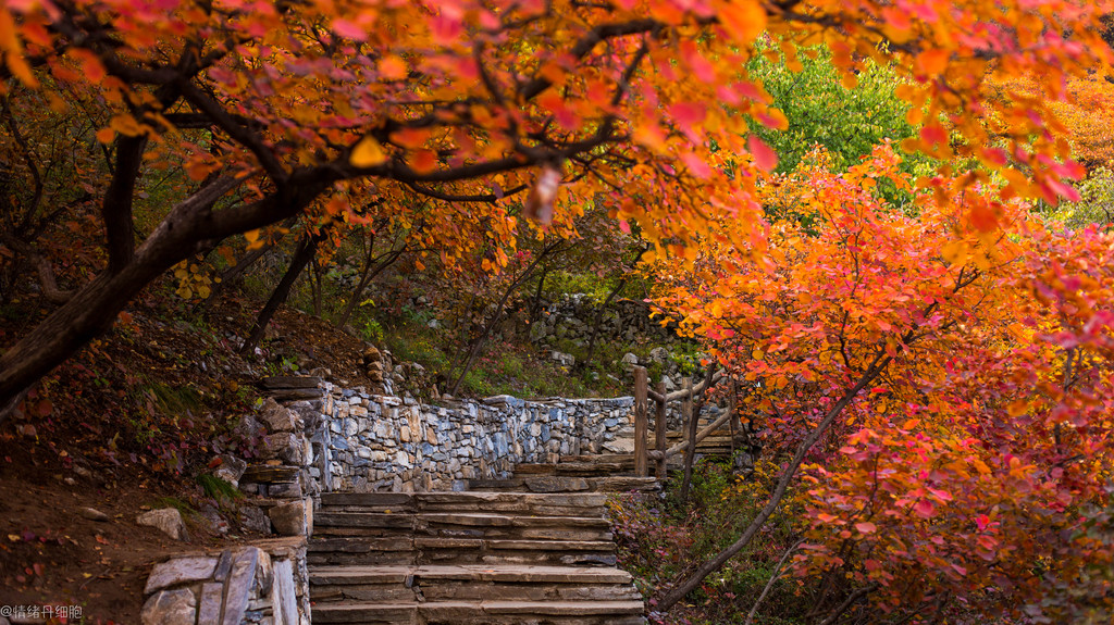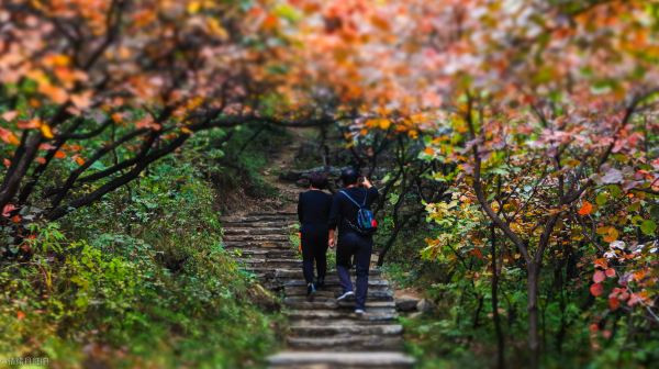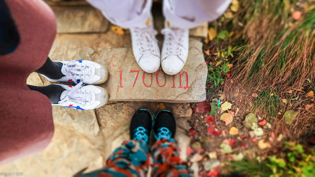 坡峰岭海拔落差不大米,坡度平缓易攀爬,但对于不常运动的我来说望不到尽头的前方是心里最大的障碍,坡峰岭的石阶上每隔一段会有米数标记。起始的地方是0米,到达云上石屋顶端是600米,黄栌王在1700米处,鹰嘴岩还要再往上走,虽然来坡峰岭几次,却没有一次走完全程的,最高便是到达2500米。由于山体海拔不同,树叶红的呈度也大不相同,越高处红的越多,山路好走,但也要穿适当的鞋子上来,想来是这山太好走,很多人穿着高跟鞋就上来了。