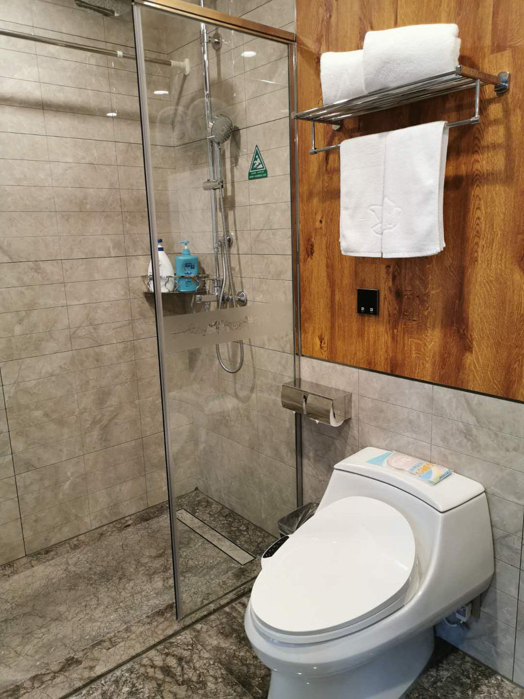 房间的窗帘是电动的,卫具是科勒的,洗漱用品也是品牌产品。大致这么一看都非常满。