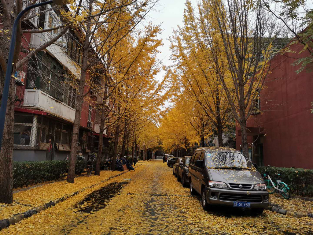去宾馆那天,刚出地铁口我就感受到秋天在条北京老街里的浓郁气息,映入眼帘的是一条银杏大道,金黄色的银杏叶有还挂在树上的,飞舞在空中的,还有铺满地面的,让我感觉这条北京老街仿佛是通往深秋记忆的一条通道。