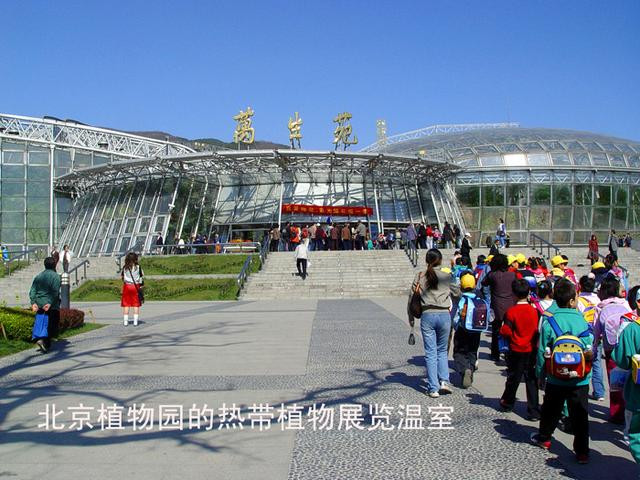 北京植物园的热带展览温室的植物种类多而全,在海内外都享有盛名。原来的温室虽然植物不少,但面积却不是很大。经过投资2.6亿元改建后的热带温室,现在已成为北京市90年代十大建筑之一,总建筑面积达到了17000平方米,总占地面积为5.5公顷。热带展览温室建筑设计由北京建筑设计研究院承担,以“绿叶对根的回忆”构想为设计主题,独具匠心地设计了“根茎”交织的倾斜玻璃顶棚,仿佛一片绿叶飘落在西山脚下。江泽民同志为热带温室亲笔题写了“万生苑”三个金光闪闪的大字。
