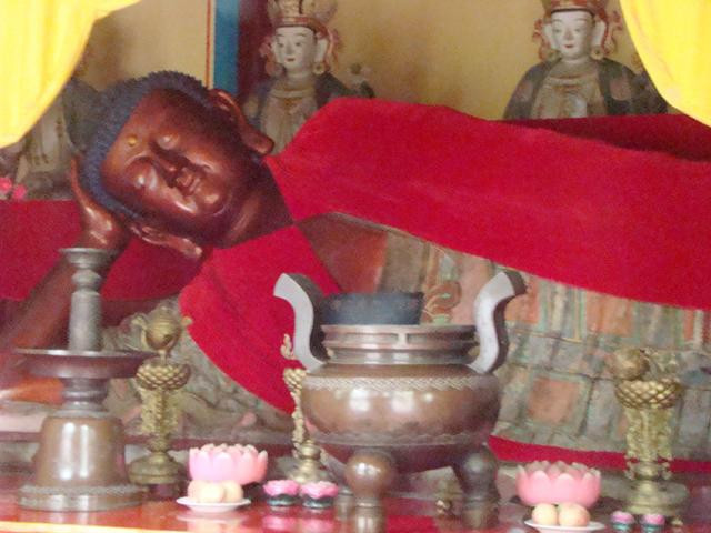 卧佛长5.3米,侧高1.4米,重54吨为世界上最大的铜质实心卧佛,是祖国文化的瑰宝。寺中环境清幽,古柏森森,银杏合抱,天王殿前有着1300多年的古腊梅更是久负盛名,也是北京隆冬、早春的赏花胜地。