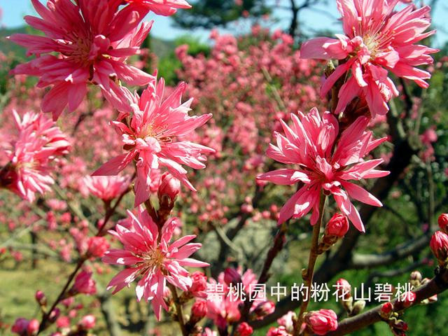 全园共有桃花近万株,形成了桃花林、桃花坡、桃花径。迎春、连翘、榆叶梅、海棠、樱花等20多种春花和桃花一起开放,衬着青松、绿柳,组成绚丽的景观。特别是香气扑鼻的白花山碧桃,是由北京植物园自己完成的第一个人工杂交的新品种,粉花山碧桃的开花时间填补了山桃与桃花花期间的空白。