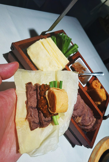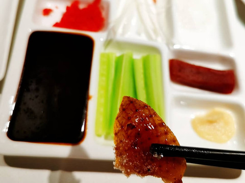 每家烤鸭店的小料碟里的东西五花八门,绝大多数都是创新吃法,传统的灵魂搭配就只有葱丝儿和甜面酱而已。千万别卷饼的时候什么都加一点,会窜味儿的。