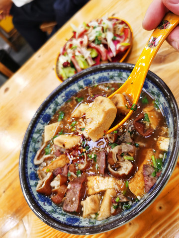 但说到北京的火烧,最常搭配的是老一辈们最爱的卤煮。一大锅极为浓郁的卤汤里,各种猪下水、猪头肉,其中最出彩最受欢迎的当然就是肥肠和猪肺。这里的火烧更像是西安的泡馍,死面的、厚厚的烧饼,切成一块块的放在卤汁里稍微煮一下,吸了卤汁,吃起来又解馋又抗饿。卤煮里必不可少的有提味的蒜泥,增香的芝麻酱,解腻的韭菜花,增鲜的豆腐乳,可以根据个人的喜好随意添加。早上起来吃一碗,也算是重口味的早餐之一了。