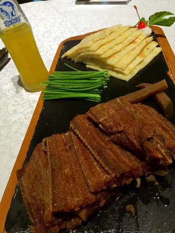 老北京家常酱肉卷饼,这个所谓的卷饼其实就是我们平时所说的煎饼,北京人又叫咯吱。吃的时候,拿一张咯吱皮儿打开,加上两片厚厚的酱牛肉,再加葱段解腻提味,浇上一勺虾皮儿鸡蛋酱增咸增鲜,再加一个炸的酥脆的咯吱卷儿,卷起来后手一用力,把咯吱卷儿挤碎,再送入口中,肉香葱香酱香混合,口感有肉的绵,葱的脆,咯吱的酥,多重复合,解馋又过瘾。