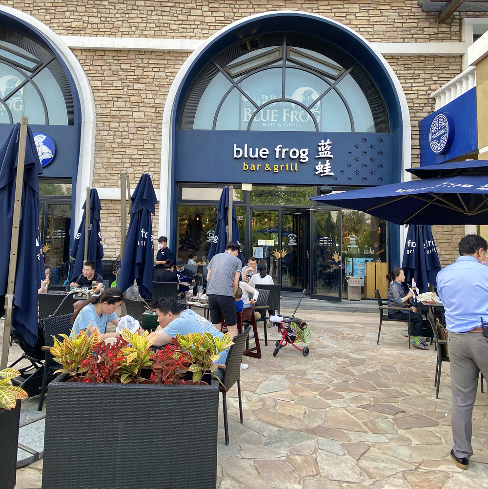 蓝蛙是连锁店,在国贸北区六层面向大裤衩建筑有一家,室外座位常年爆满。蓝色港湾这家,店面不小,室内的相对安静。环境不错,有宝宝椅。室外餐桌等位的人很多。
