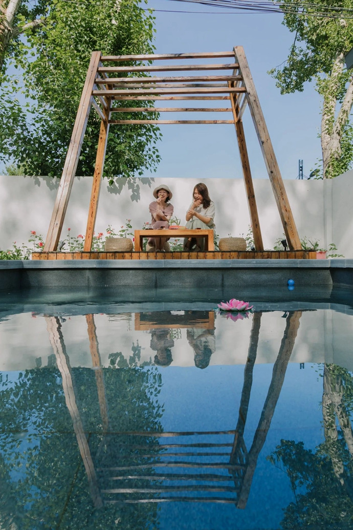 水池旁是一个日式小凉亭,若是想拍照打卡也可以在顶层围一圈纱幔,一定十分浪漫。清爽山风里,两三个人在蒲团一坐,喝茶吃酒逍遥似神仙。