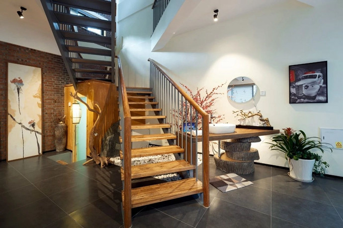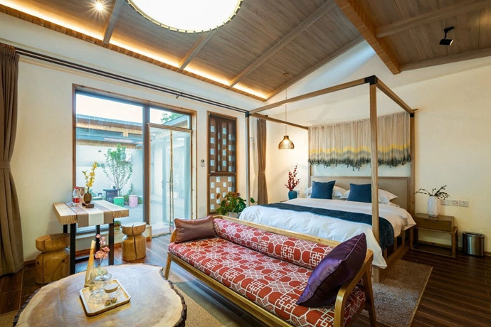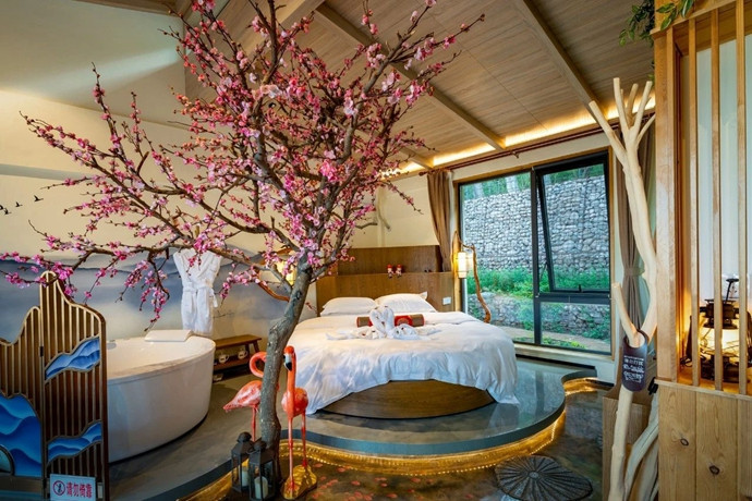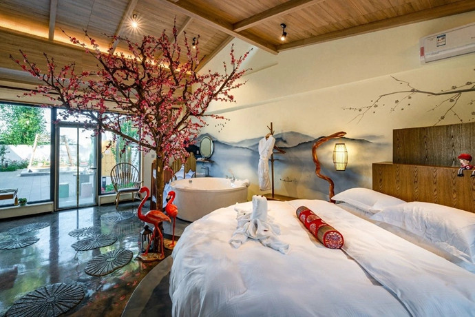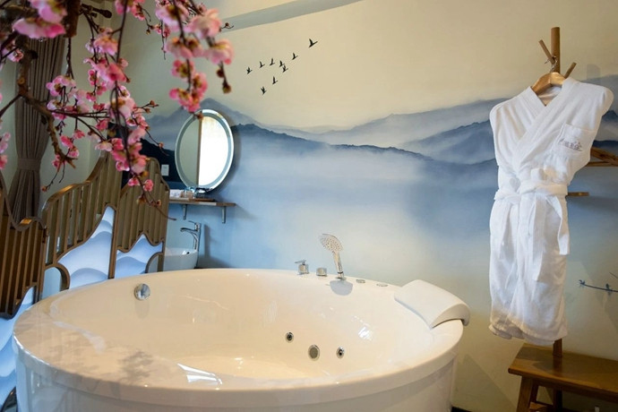 小院里有4间大床房、1间阁楼榻榻米房,带loft休闲共享空间。其中最有特色的便是这间主题圆床房,直径2m的大圆床被屏风和梅花半遮半掩着,大大的圆形浴缸就在一旁,地面上的荷叶也是凹凸设计力求逼真,有一种踏莲而归的小浪漫…