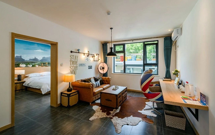 剩下的4个人,选了一间豪华套房和一间标间,除此外他家还有大床房、亲子套房、家庭套房。主楼内唯一一间豪华套房,以简约英伦风为主调设计,客厅里绵软的欧式沙发、米字旗休闲皮椅、剪裁良好的地毯与皮箱式茶几完美融合,充满了绅士气质。