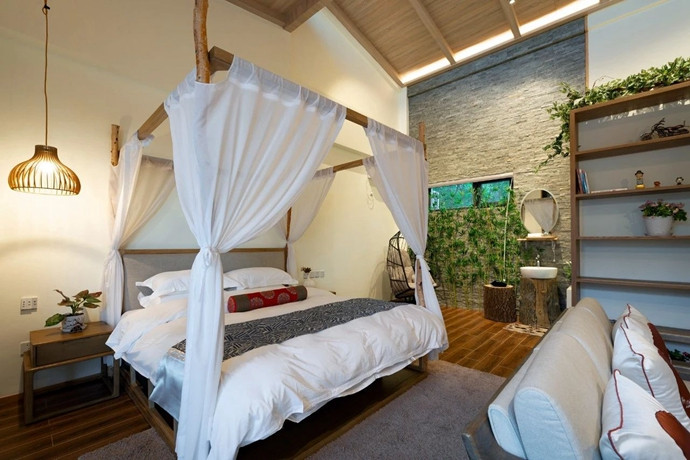 其他3间大床房,从飘逸帷幔、到规矩典雅,1.8米的大床均可容纳2大1小。阁楼榻榻米,两张床可分可拼十分灵活。