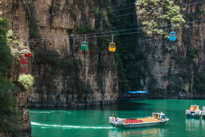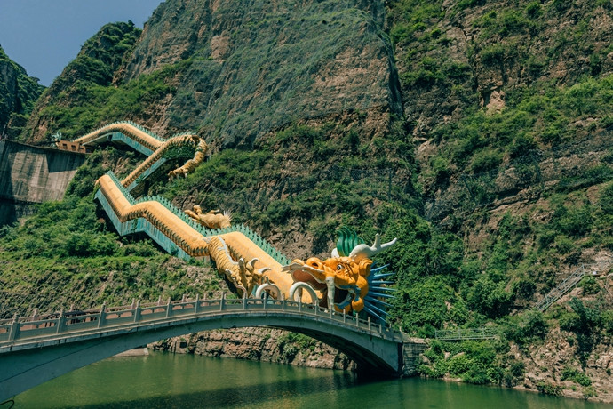 进景区不久,就能看到盘旋于山壁的巨龙,由龙口开始便是电梯方便游客上行。进了龙庆峡,就一定要乘船游览,一席冷翡翠色的碧湖,九曲十八弯的山川风景,水波在船与山壁间回荡,道一句“柳暗花明又一村”绝不为过。