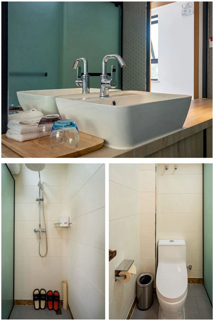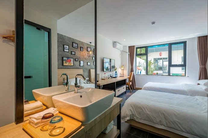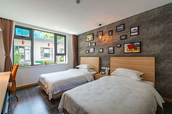 双床标准间,主打工业风,黑色吊灯架、复古汽车照片与深灰色墙壁相映成趣,经典而不落时尚。柔软的白鸭绒棉品被褥,床宽1.3m又相对独立,给客人朋友们提供了更好的睡眠体验。